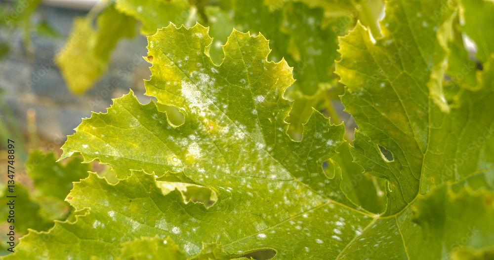 CLOSE UP: Gray patches on vibrant green zucchini leaf infected with powdery mildew. Fungal infections have affected summer vegetables in the garden. Importance of proper plant care and disease control