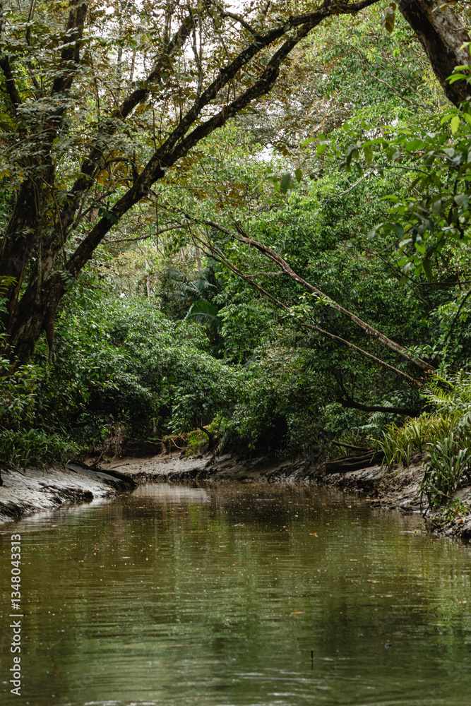 Tropical river flowing through lush green forest in Sierpe, Costa Rica