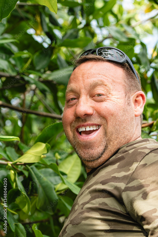 Smiling man wearing sunglasses and camouflage shirt in a lush green environment