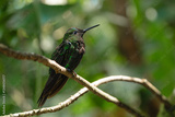 Emerald green hummingbird perched on branch in tropical rainforest