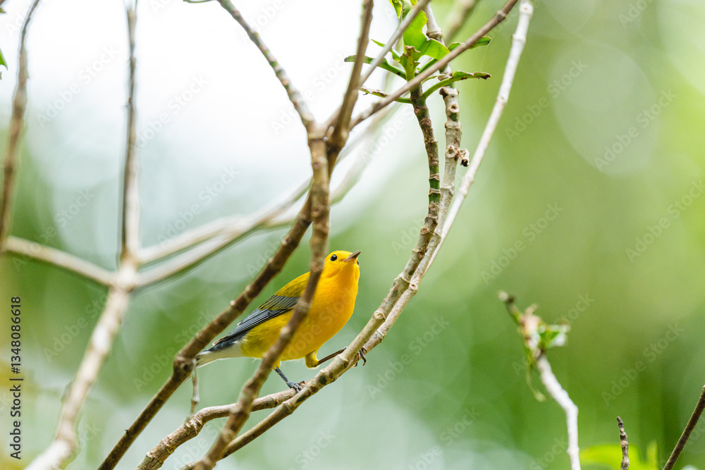 Yellow warbler climbing among branches in tropical forest