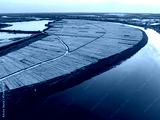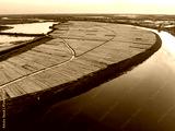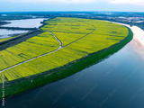 Rural pastoral scenery, river rapeseed flowers overlooking