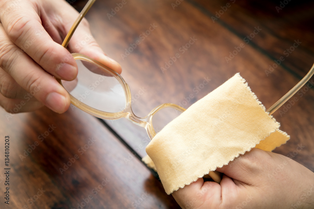 Reinigung der Gläser einer Brille mit dem Mikrofasertuch