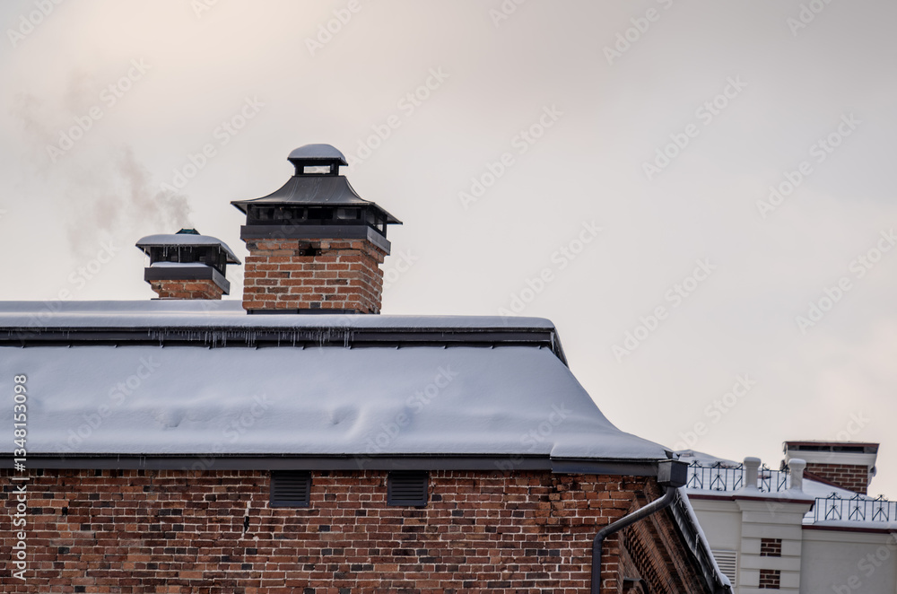 Chimneys on the roof of a brick building.