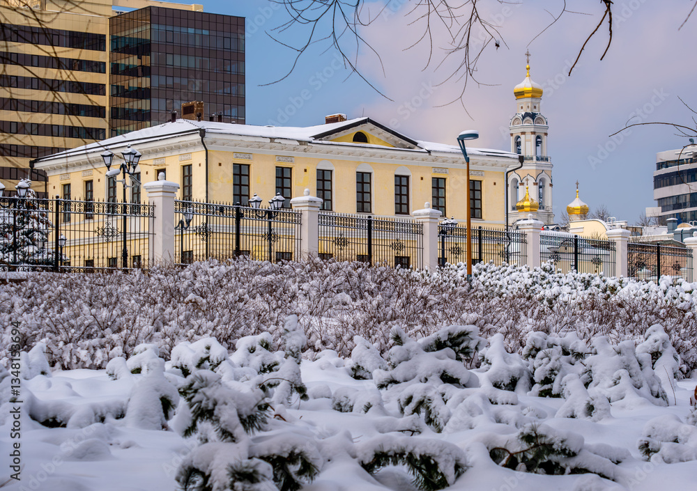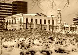Plants under the snow in a park in the city on a winter day.