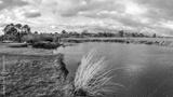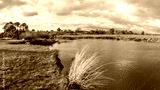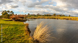 Tranquil riverbank of the South Esk River in Tasmania, lined with grasses and surrounded by open pastureland or farmland, showcases a serene rural riverside environment in regional Australia