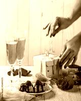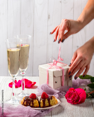 Muffins with strawberries and chocolate, two glasses of champagn