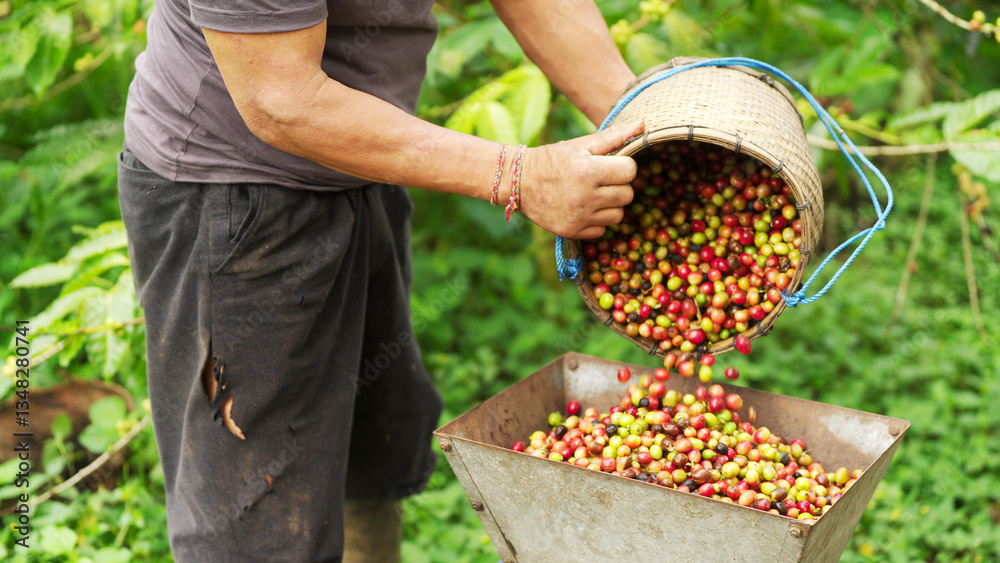 Arabica coffee farmer pouring harvested cherries or berries into mechanical pulper in rural setting, the equipment separates the pulp from the green beans