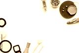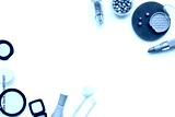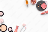Makeup accessories - brushes and pink pastel cosmetic products, flat lay, top view