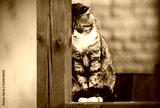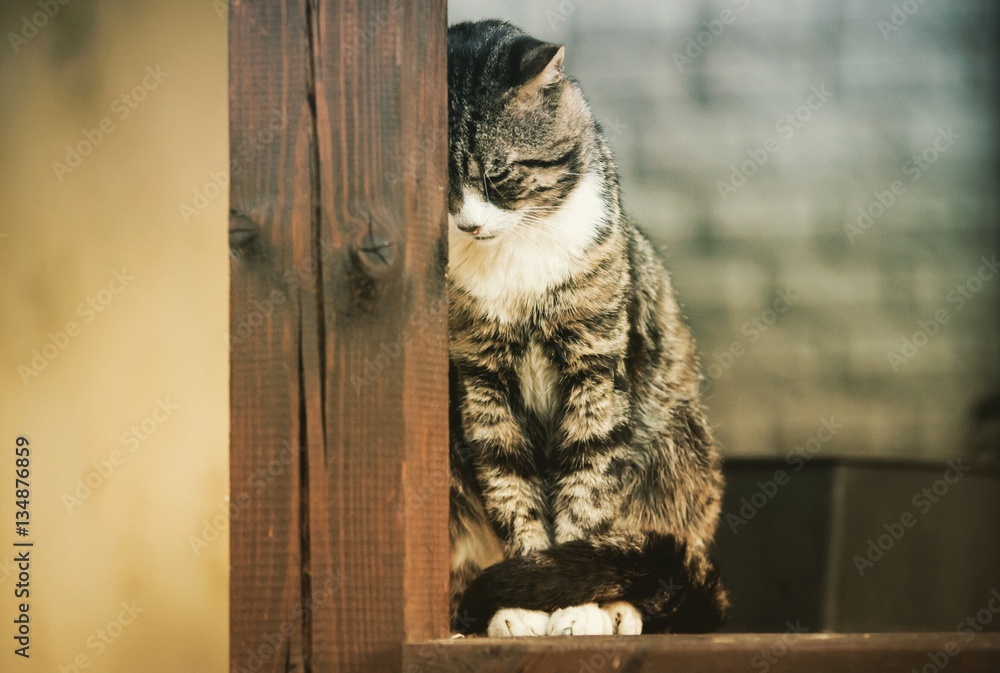 Zmartwiony kot, opiera się o drewnianą belkę.