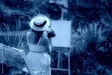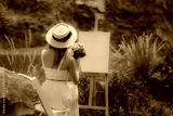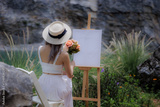 asian woman in white dress and hat sitting on wooden chair by the lake and holding rose flower white drawing.