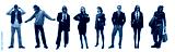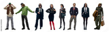 Expressive office fashion merges vintage elegance. Set with five models, men and women dressed in stylish and trendy clothes, confidently posing against white background. Concept of fashion, trends