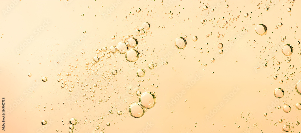 Macro of yellow golden liquid with many bubbles. Bubbles of different sizes and shapes, creating a textural effect on a light background.
