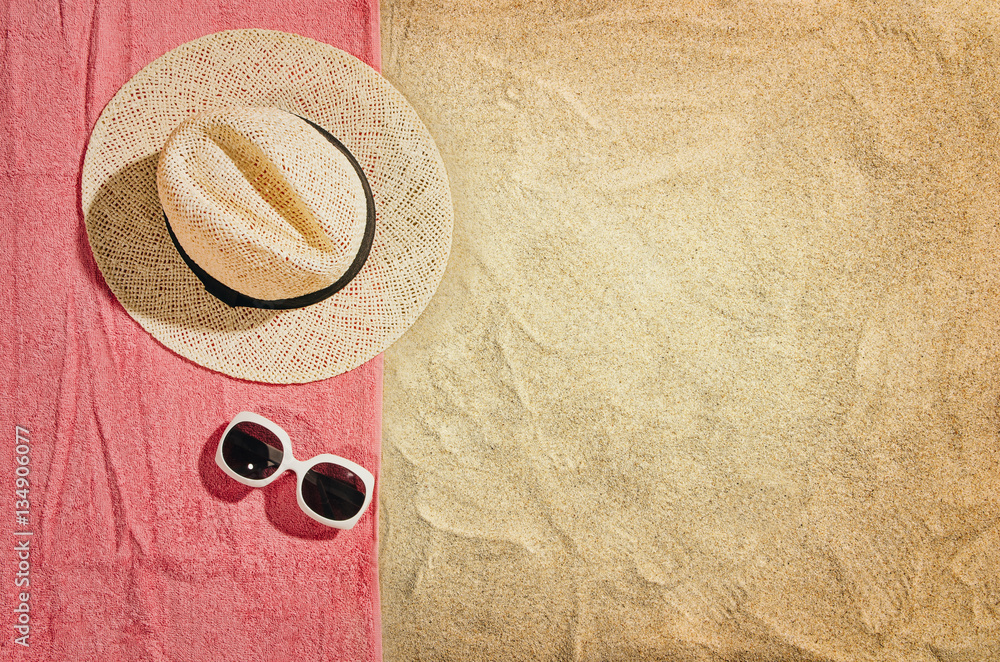 Top view of sandy beach with towel frame and summer accessories. Background with copy space and visible sand texture. Left border made of towel