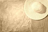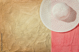 Top view of sandy beach with towel frame and summer accessories. Background with copy space and visible sand texture. Right border made of towel