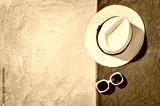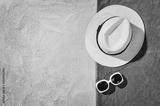 Top view of sandy beach with towel frame and summer accessories. Background with copy space and visible sand texture. Right border made of towel