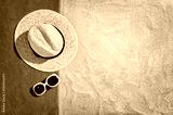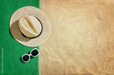 Top view of sandy beach with towel frame and summer accessories. Background with copy space and visible sand texture. Left border made of towel