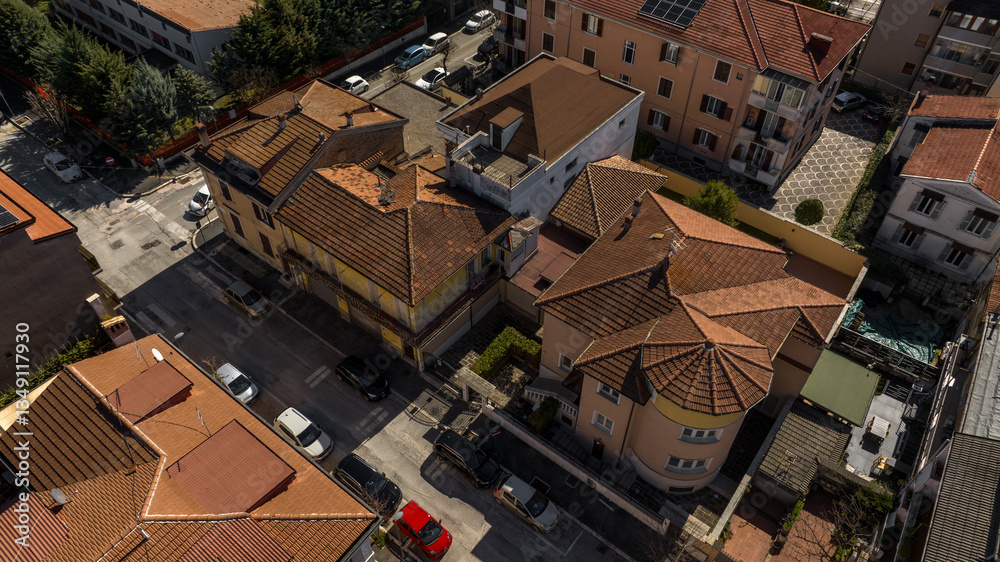 Aerial view of a group of houses in a residential area in Italy.