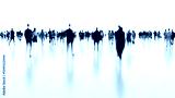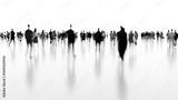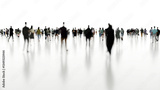 Blurred silhouettes of businesspeople walking on white floor toward bright light