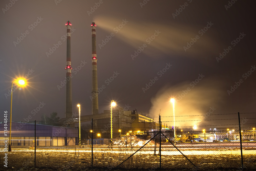coal heating plant in the winter smog season, power plant with two chimneys at night