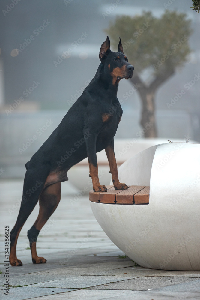 Portrait of a doberman pinscher dog outdoors.