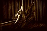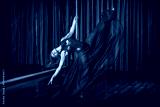 Young pole dancer girl in mask and red skirt sitting indoor near the pole on curtain background