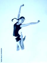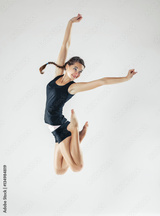Young beautiful slim girl with hair braid doing dance or pilates exercise on white studio background