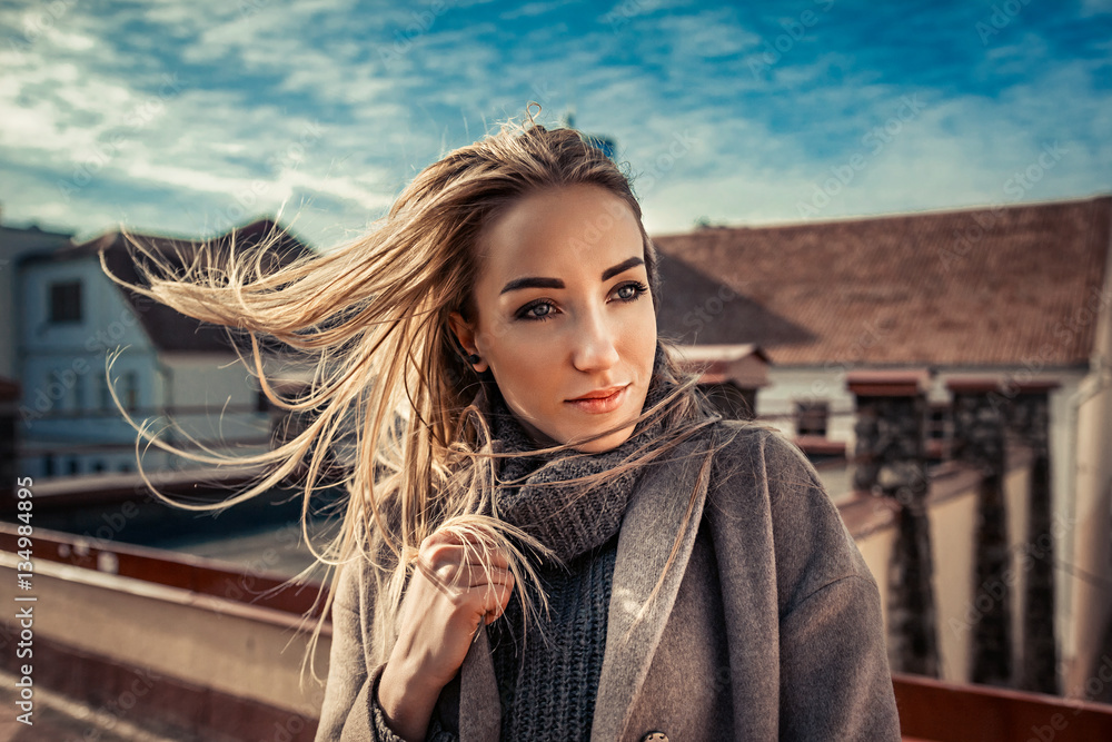 Art outdoor portrait of a beautiful blonde girl in a sunny autumn weather