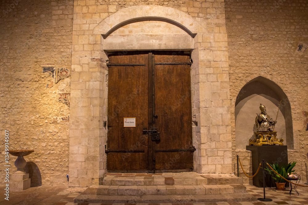 Closeup of the Holy Door located in the Basilica of Santa Maria di Collemaggio in L’Aquila, Abruzzo, Italy.