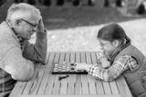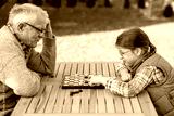 Elderly grandfather and young granddaughter playing checkers together at a wooden table in a garden, enjoying quality family time and strategic thinking outdoors in autumn