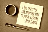 I am grateful for another day to move, explore and thrive - morning positive affirmation on a napkin with tea