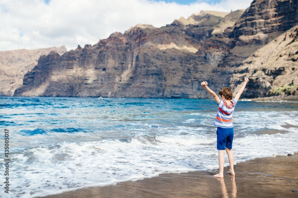 Happy child playing on beach.