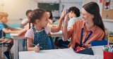 Education, teacher and high five girl in classroom for lesson support, creative activity and learning progress. People, educator and student with fine motor skills success and knowledge development