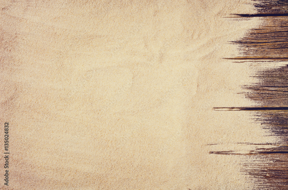 Top view of sandy beach frame. Background with copy space and visible sand texture.