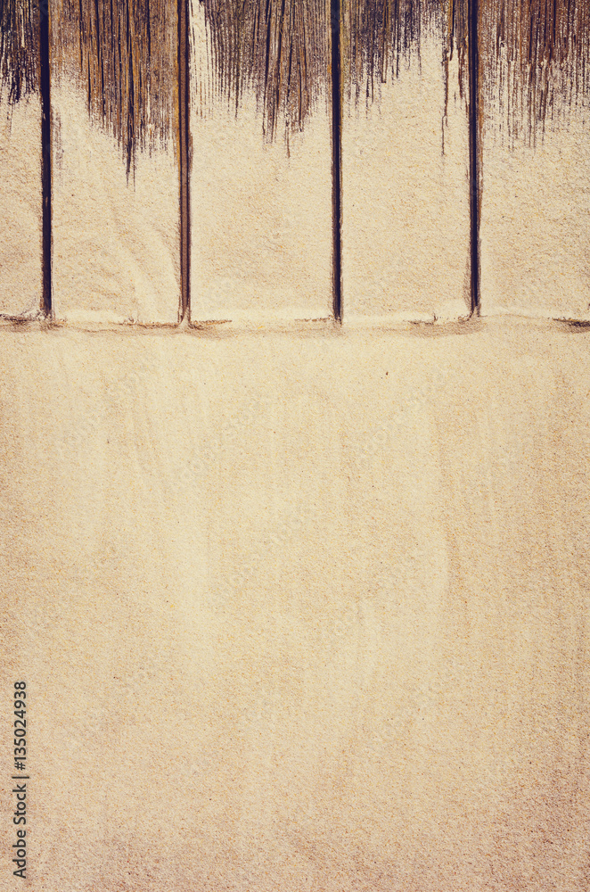 Top view of sandy beach frame. Background with copy space and visible sand texture.
