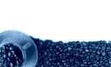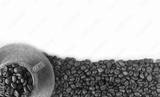 Coffee beans and a cup at border of image with copy space for text. Coffee background.