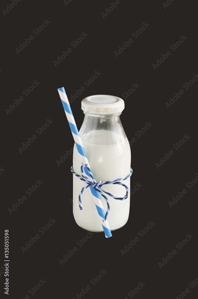 Milk bottle with striped straw. Cow's milk isolated on black background