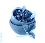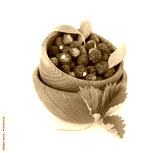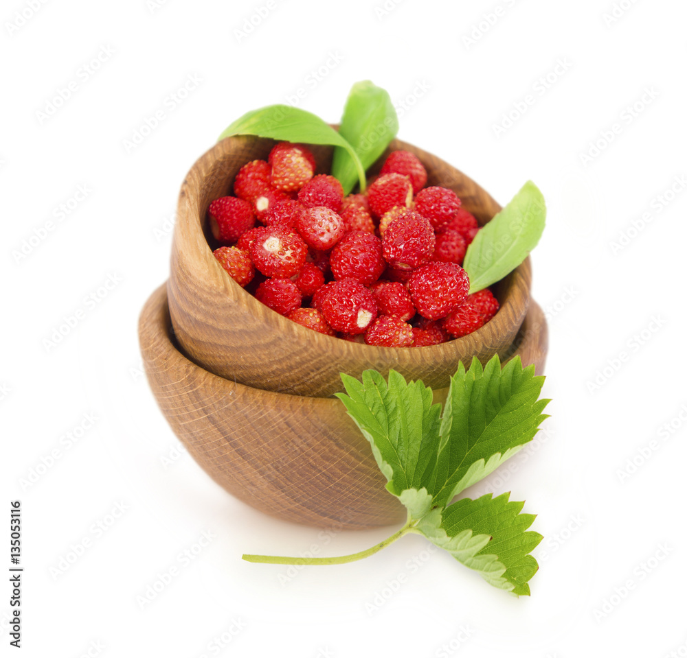 Wild small strawberries in a wooden bowl with leaves. Ripe and tasty strawberries isolated on white background. Sweet and juicy berry with copy space for text.