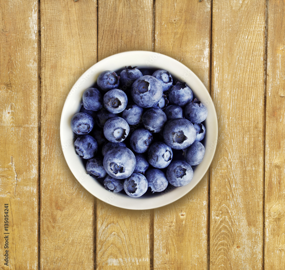 Blueberries in a white ceramic bowl. Top view. Ripe and tasty blueberries on a wooden background.