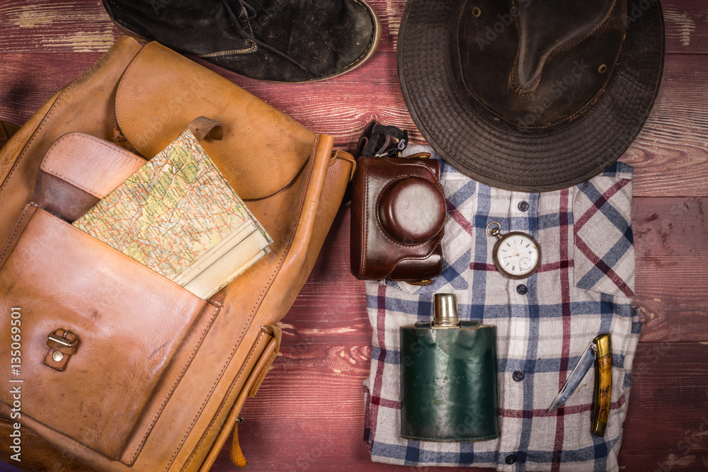 des accessoires pour l'aventure avec sac à dos, chaussures, chemise et chapeau sur des planches en bois