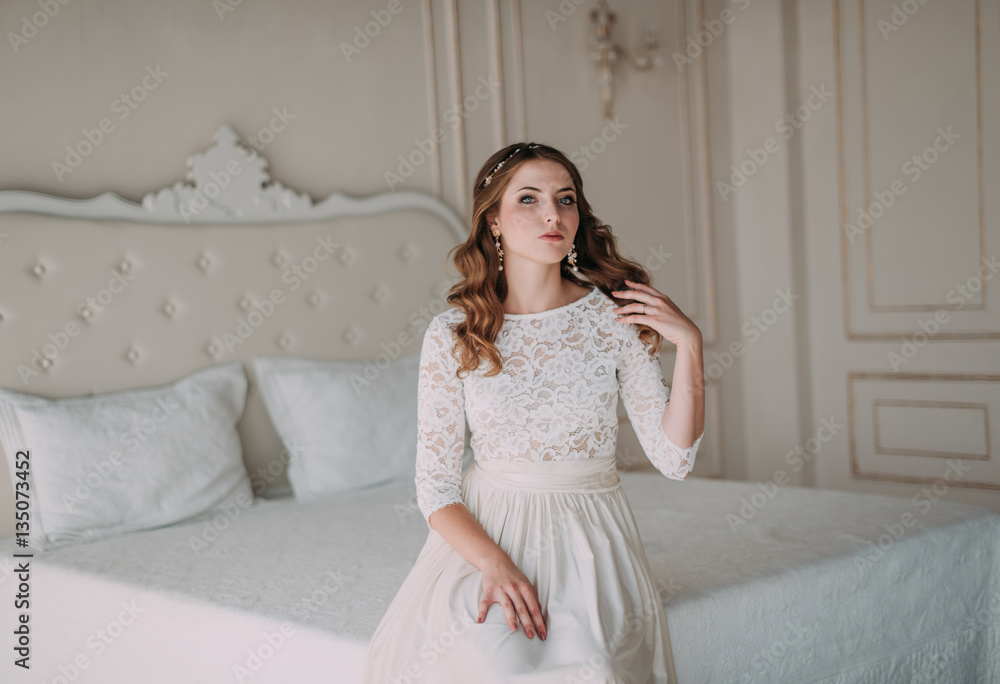 fashion studio photo of beautiful elegant bride with dark hair in luxurious wedding dress with headband