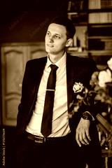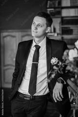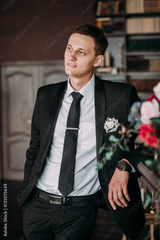 Groom in a suit holding buttonhole