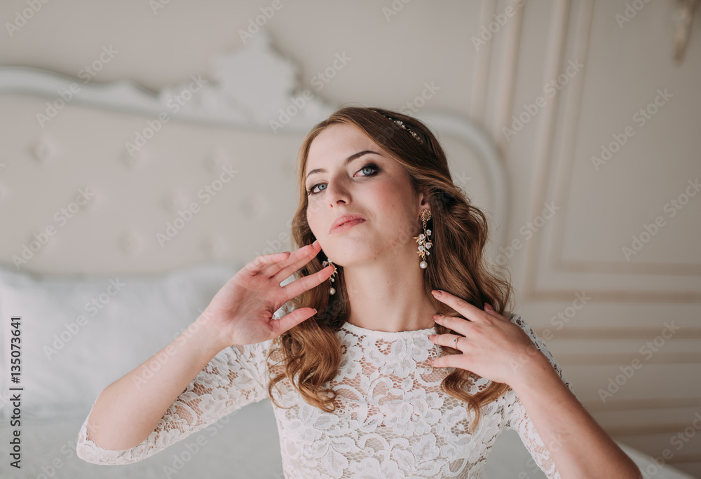 fashion studio photo of beautiful elegant bride with dark hair in luxurious wedding dress with headband