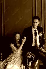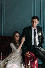 cute wedding couple in the interior of a classic studio posing at the sofa . hey kiss and hug each other, holding hands looking at each other