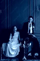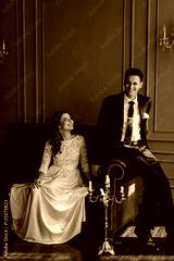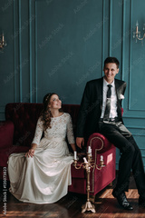 cute wedding couple in the interior of a classic studio posing at the sofa . hey kiss and hug each other, holding hands looking at each other