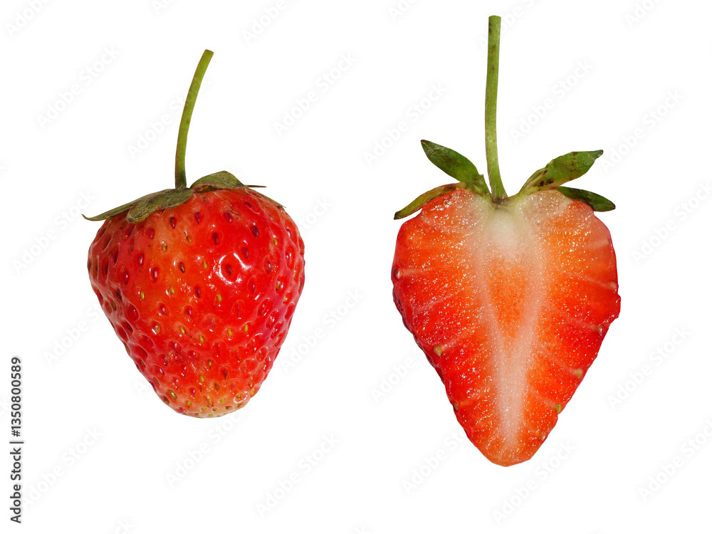 Red berry strawberries fruit isolated on transparent background, Ripe strawberry cut in half revealing the juicy flesh inside
