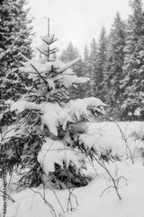 It's snowing and the forest glitters in the winter landscape. The snow-covered spruces stand out against the soft background.
