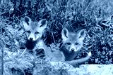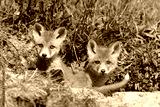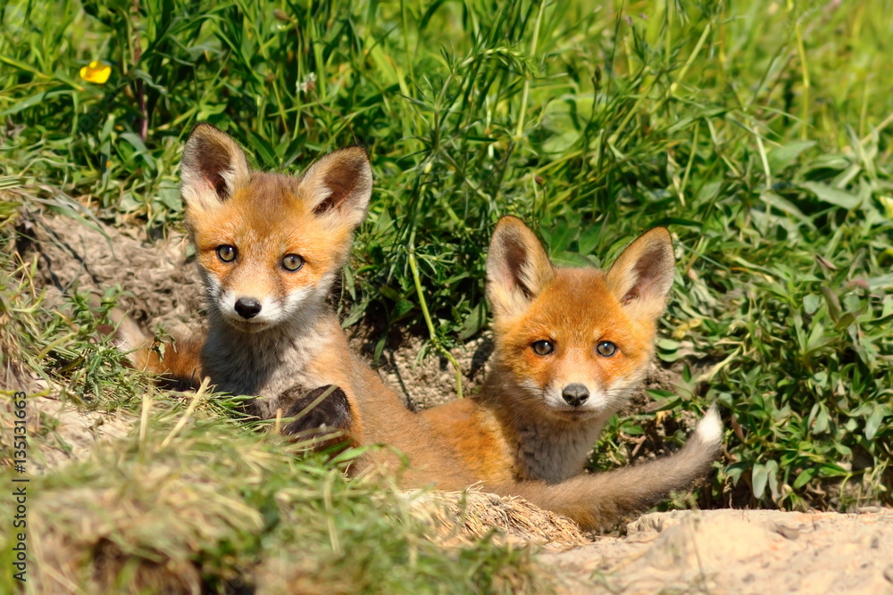 cute red fox siblings at the entrance of the den