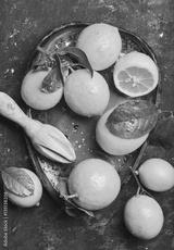 Close-up of freshly picked lemons with leaves in bright blue ceramic plate over dark blue shabby plywood background, top view, vertical composition