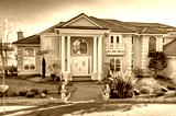 Mediterranean style waterfront home with stucco walls and columned porch